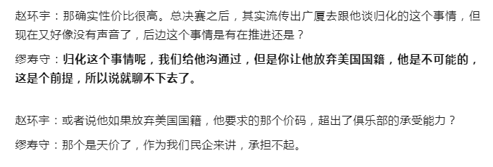根据此前媒体报道,巴里-布朗是中国男篮主帅郭士强关注的归化人选,但之后则是逐渐没有动静,而篮协上半年已经发文呼吁俱乐部去推进归化事宜。根据媒体人赵环宇专访广厦总经理缪寿守,缪寿守回应表示:“归化这个事情,我们给他沟通过,但是你让他放弃美国国籍,他是不可能的,这是个前提,所以说就聊不下去。”