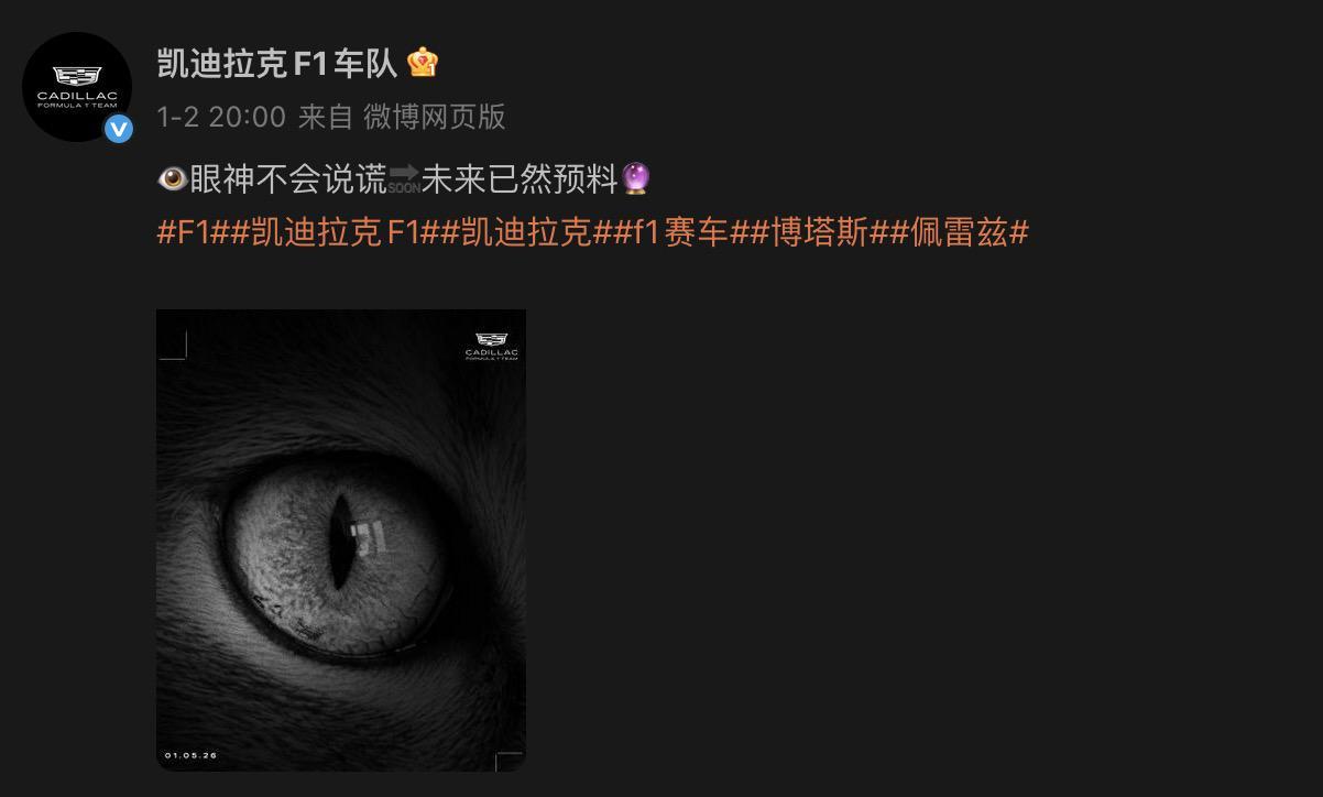 这张被许多车迷指认为周冠宇宠物“玉米粒”的猫眼特写图片中,左下角清晰映出了数字“24”——正是周冠宇在F1效力索伯车队时期的正式比赛号码。图片的左下角标注了日期“2026年1月5日”,配文则写道“眼神不会说谎,未来已然预料”。这一系列高度指向性的元素,被外界普遍解读为凯迪拉克车队与周冠宇的“官宣密码”,即将在1月5日(即今天)官宣周冠宇以储备车手身份加盟的信号。