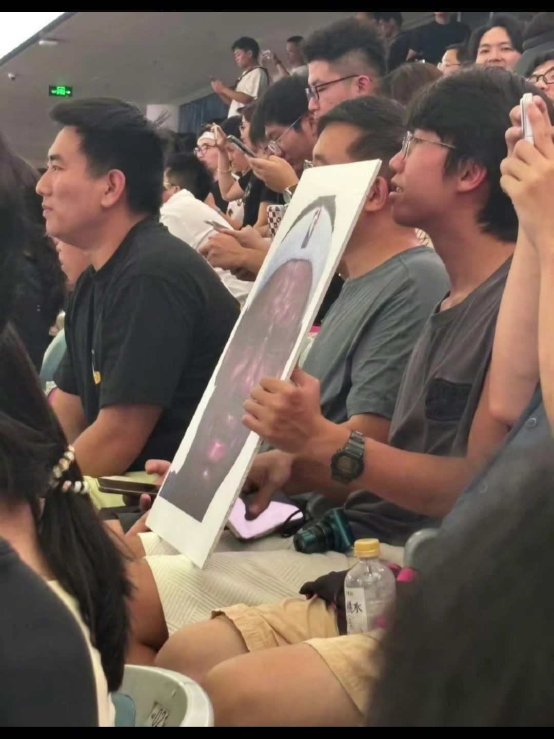 开云登录-詹姆斯中国行成都活动现场 一球迷拿着詹姆斯经典哭脸照坐在场边