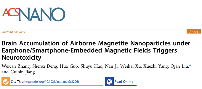 中国科学院生态环境研究中心江桂斌教授(中国科学院院士、发展中国家科学院院士,美国国家工程院外籍院士)、刘倩研究员最新研究揭示,当吸入含有磁铁矿纳米颗粒的空气污染物时,若同时暴露于耳机或智能手机内置的磁场,大脑中的污染物积累量将增加五倍,并引发严重的神经毒性。研究团队通过构建小鼠共暴露模型发现,磁场显著改变了磁性颗粒在体内的分布行为,导致其在大脑中富集,进而损害认知功能。这一发现首次将材料的磁性、外部磁场与神经毒性联系起来,指出外界磁场可以通过磁性纳米颗粒这一“媒介”间接对大脑产生危害。相关论文以“Brain Accumulation of Airborne Magnetite Nanoparticles under Earphone/Smartphone-Embedded Magnetic Fields Triggers Neurotoxicity”为题,发表在