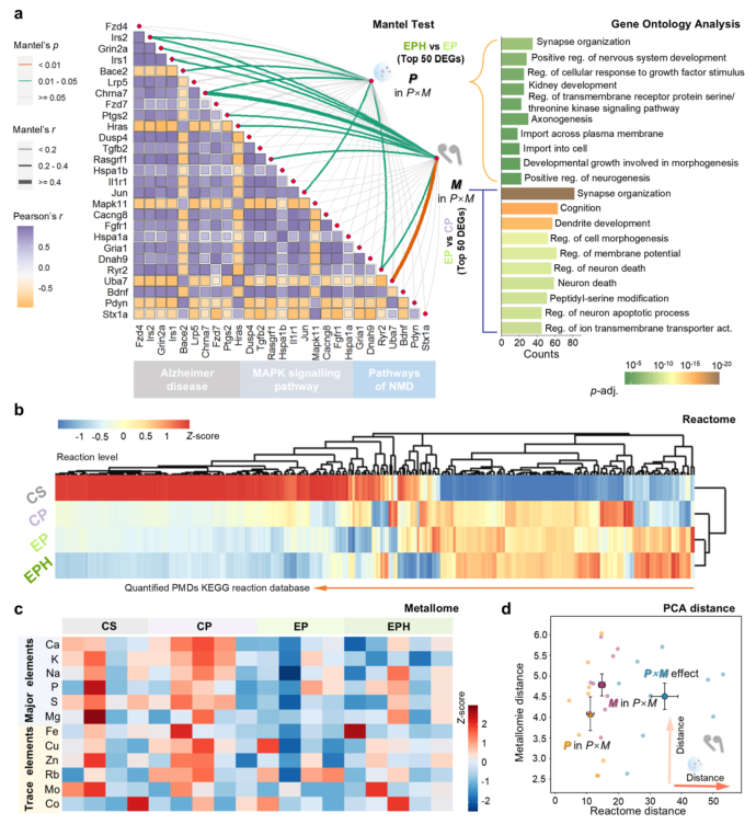 图5. 共暴露中EEM对神经毒性的贡献。 (a) PM₂.₅暴露与磁场暴露与共暴露效应的Mantel检验相关性。 (b) 四个实验组(EPH、EP、CP、CS)的血浆反应组热图。 (c) 四组小鼠血浆中的金属组。 (d) 基于组学特征主成分分析距离对血浆中分子反应和金属变化的共暴露效应量化。